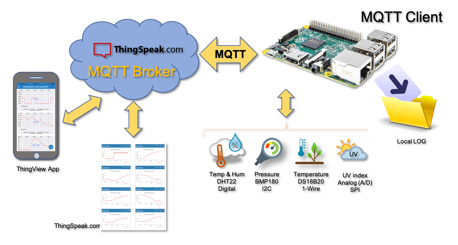 Skratka, vsi podatki bodo zajeti, shranjeni lokalno v datoteki CSV in poslani v storitev interneta stvari (ThingSpeak.com) prek protokola MQTT, kot lahko vidite na spodnjem diagramu
